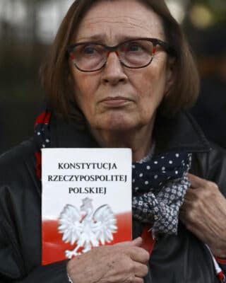 Foto: Una donna mostra una copia della Costituzione polacca, in attesa del verdetto della Corte Costituzionale sul primato tra diritto nazionale ed europeo – Varsavia, 7 ottobre 2021 (Jaap Arriens / AFP).