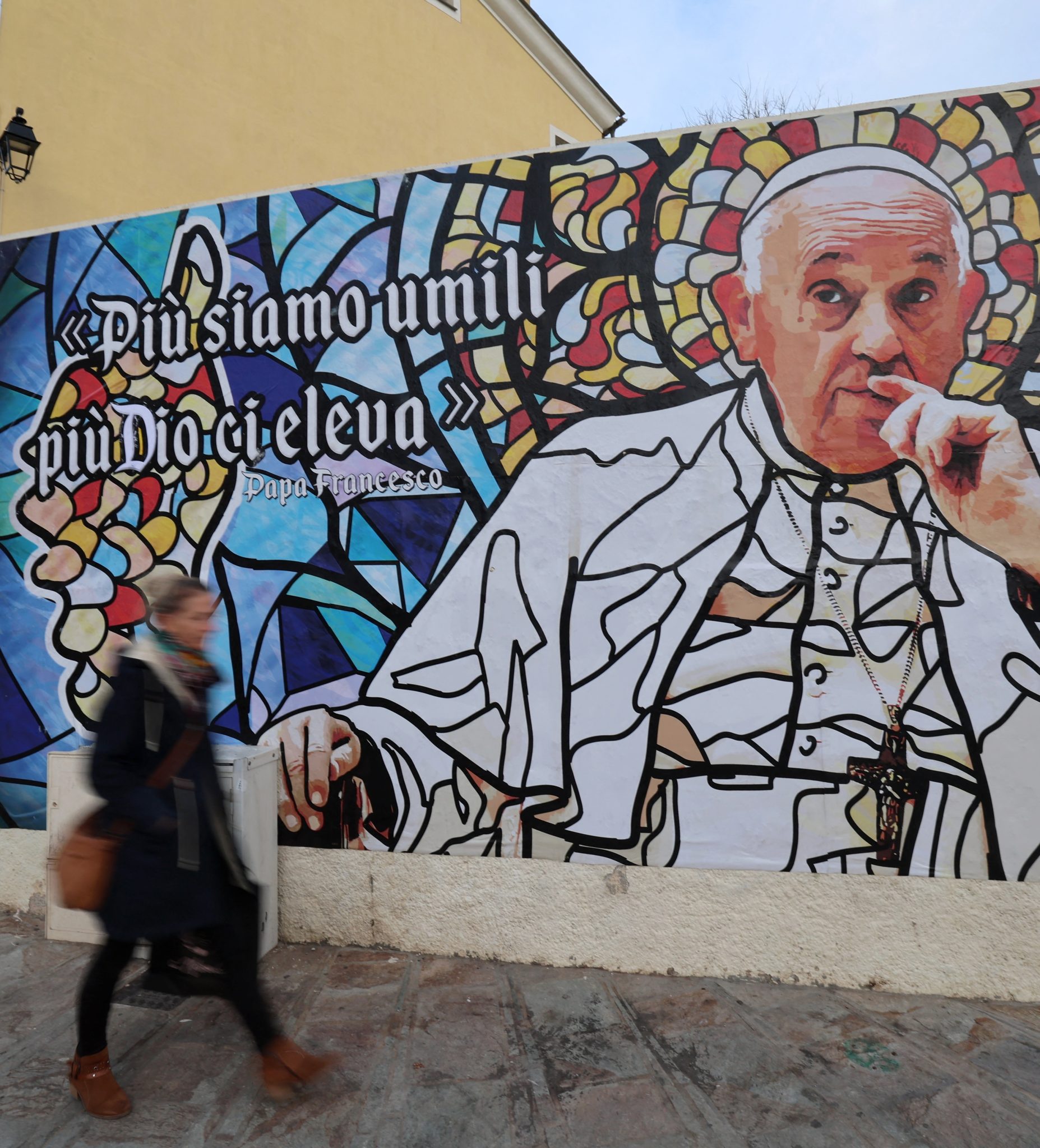 Immagine di copertina: una donna cammina di fronte a un murales raffigurante Papa Francesco, vicino alla cattedrale di Ajaccio, in Corsica, il 10 dicembreo 2024. (Foto di Pascal Pochard-Casabianca / AFP)
