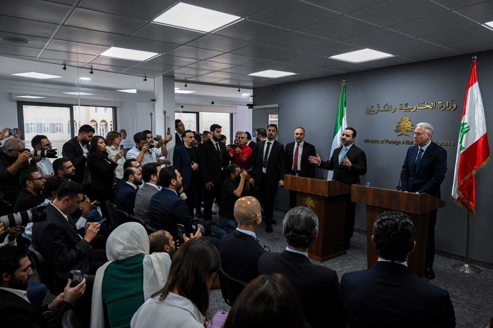 Immagine di copertina: l’incontro a Beirut dei ministri degli Esteri di Libano, Youssef Rajji, e Siria, Asad al-Shaibani, dopo l’incontro il 10 ottobre 2025 (foto di Joseph Eid / Afp).