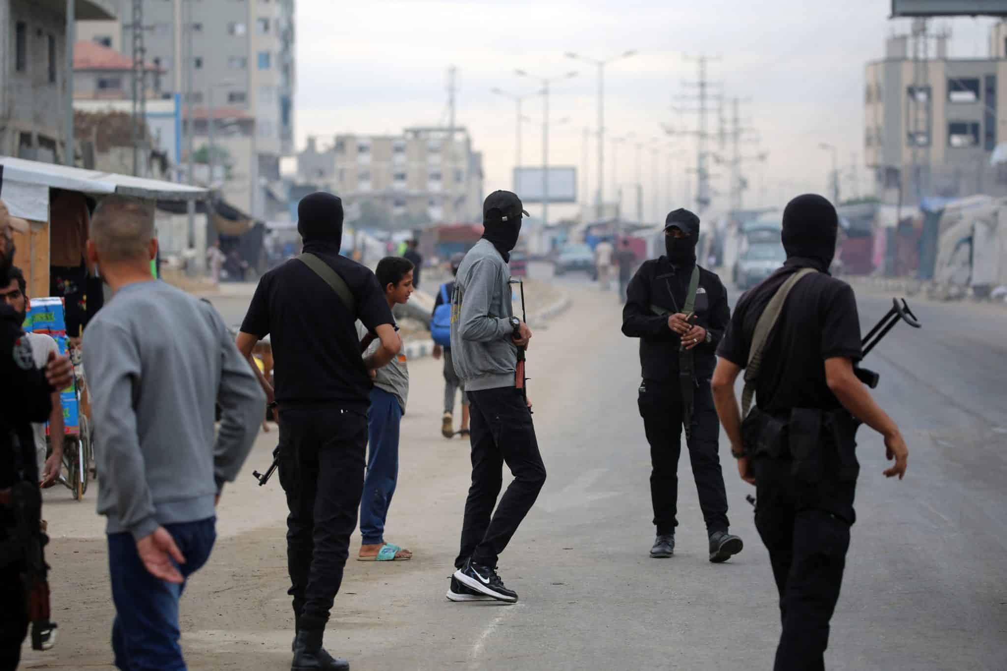 Immagine di copertina: alcuni membri delle forze di sicurezza interna legati a Hamas gestiscono un checkpoint al campo profughi di Nuseirat, nella Striscia di Gaza, il 12 ottobre 2025 (foto di Eyad Baba / AFP).