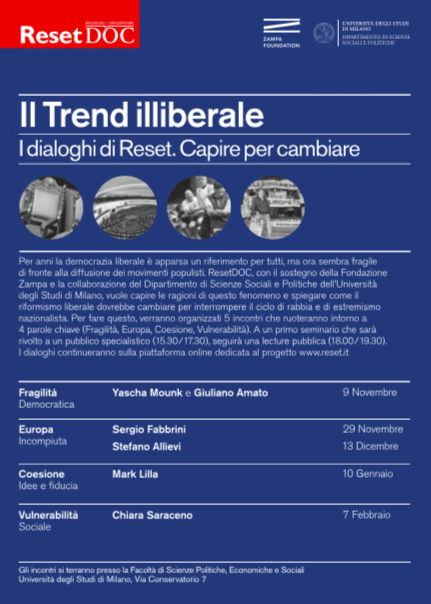 I Dialoghi di Reset sul Trend illiberale, organizzati con il sostegno della Fondazione Zampa e la collaborazione del Dipartimento di Scienze Sociali e Politiche dell’Università degli Studi di Milano, includeranno 5 incontri che ruoteranno intorno a 4 parole chiave: Fragilità, Europa, Coesione e Vulnerabilità.