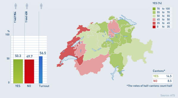 Basilea è la capitale del no con il 61%, risposta che ha vinto anche a Ginevra, Vaud e Neuchâtel. A Zurigo la differenza è stata di sole 50 schede con il 49,94 dei sì.