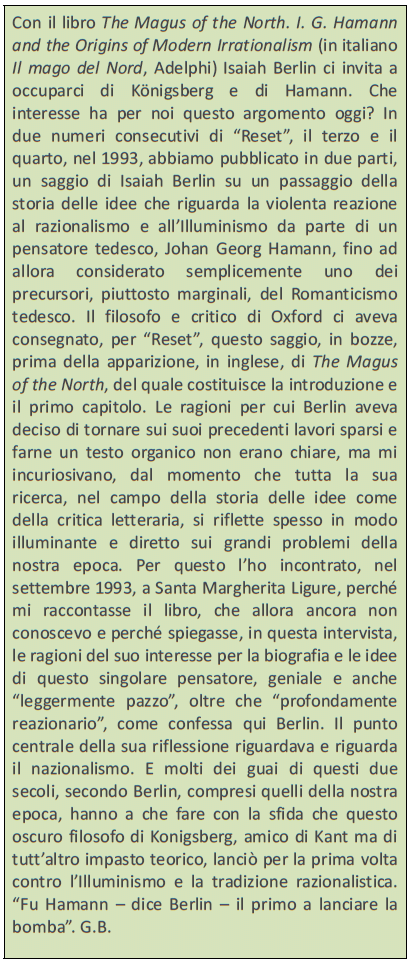 In occasione delle due presentazioni, a Milano il 19 novembre e a Roma il 3 dicembre dell’ultimo libro di Andrea Carandini, Paesaggio di idee. Tre anni con Isaiah Berlin (Rubbettino 2015), ripubblichiamo oggi una intervista con il grande filosofo di Oxford pubblicata su uno dei primi numeri di Reset (n. 5, aprile 1994) poco prima dell’uscita del suo libro Il Mago del Nord. Hamann e le origini dell’irrazionalismo moderno.