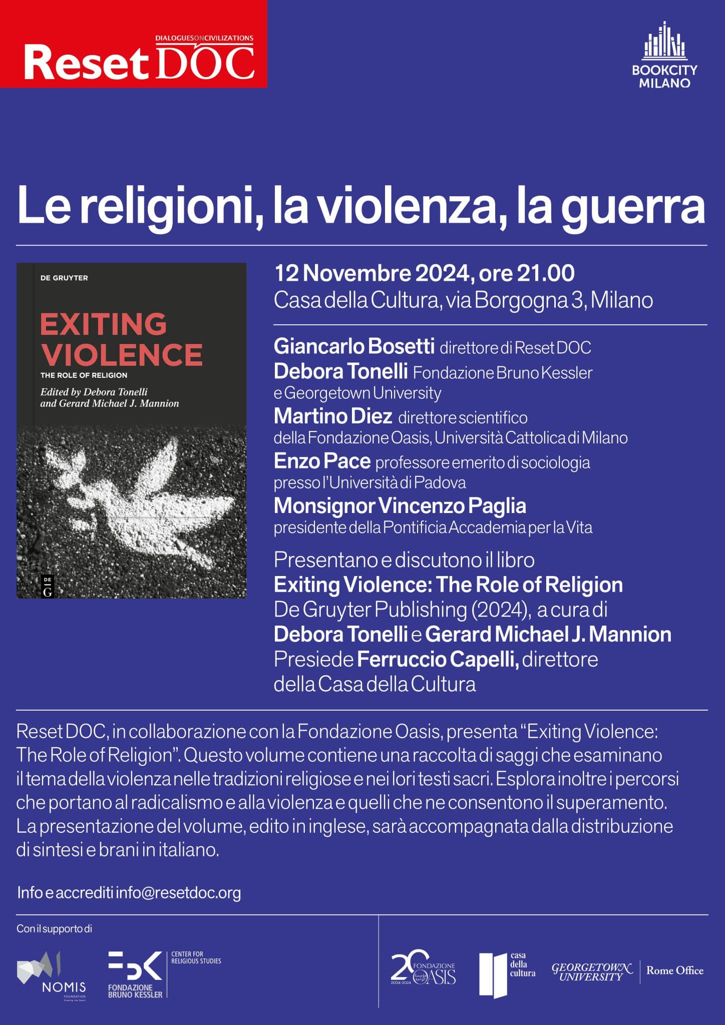 Reset DOC, in collaborazione con la Fondazione Oasis, presenta Exiting Violence: The Role of Religion, a cura di Debora Tonelli e Gerard M. J. Mannion (De Gruyter Publ., 2024). Questo volume contiene una raccolta di saggi che ha esaminato il tema della violenza nelle tradizioni religiose e nei loro testi sacri. Esplora inoltre i percorsi che portano al radicalismo e alla violenza e quelli che ne consentono il superamento. La presentazione del volume, edito in inglese, sarà accompagnata dalla distribuzione di sintesi e brani in italiano.