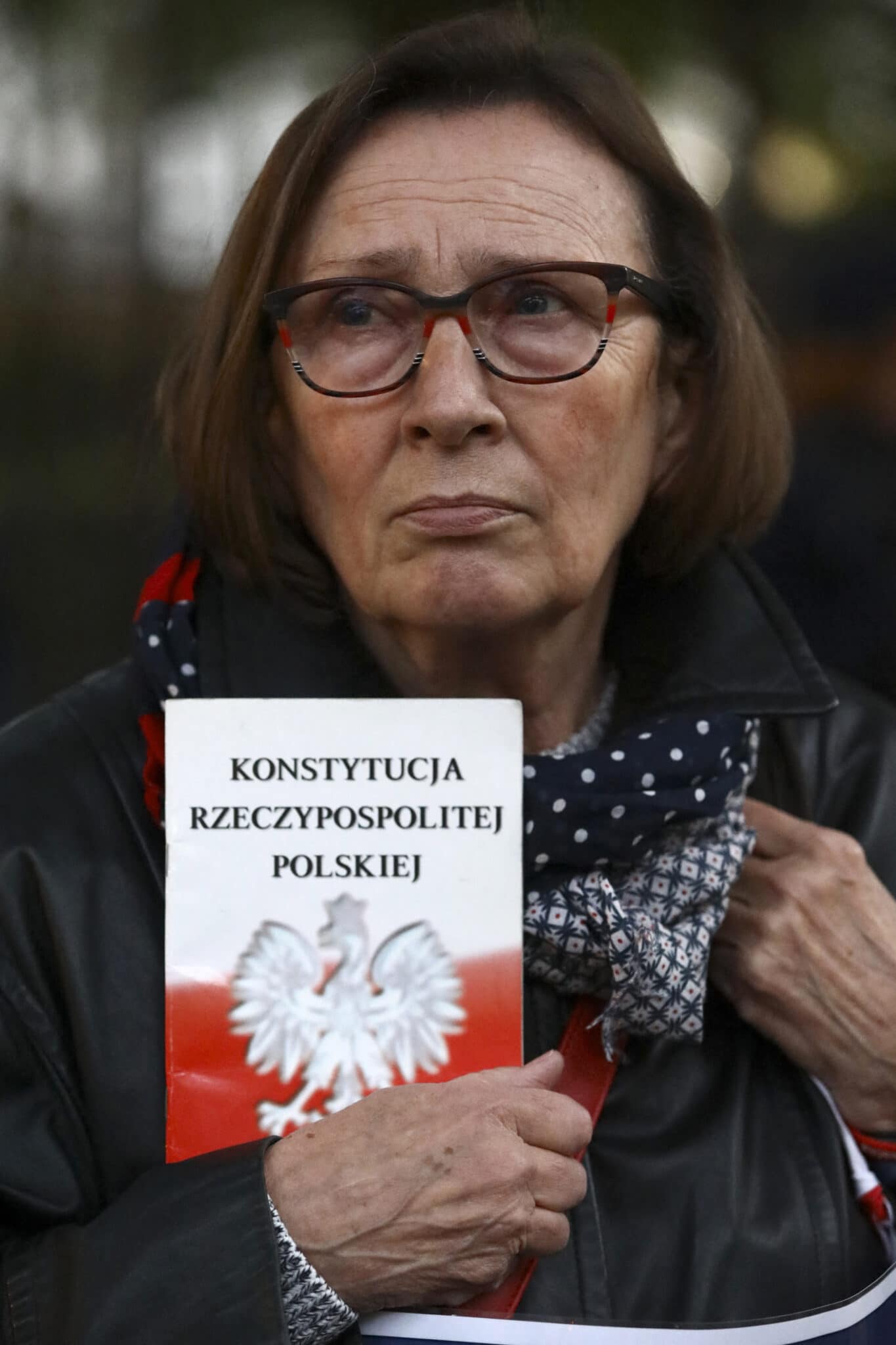 Foto: Una donna mostra una copia della Costituzione polacca, in attesa del verdetto della Corte Costituzionale sul primato tra diritto nazionale ed europeo – Varsavia, 7 ottobre 2021 (Jaap Arriens / AFP).