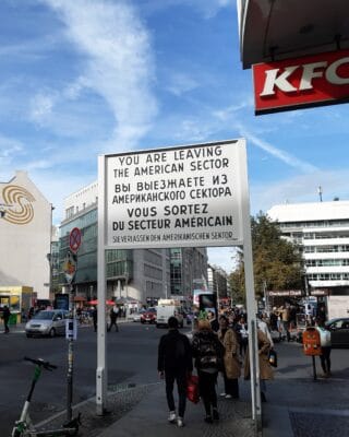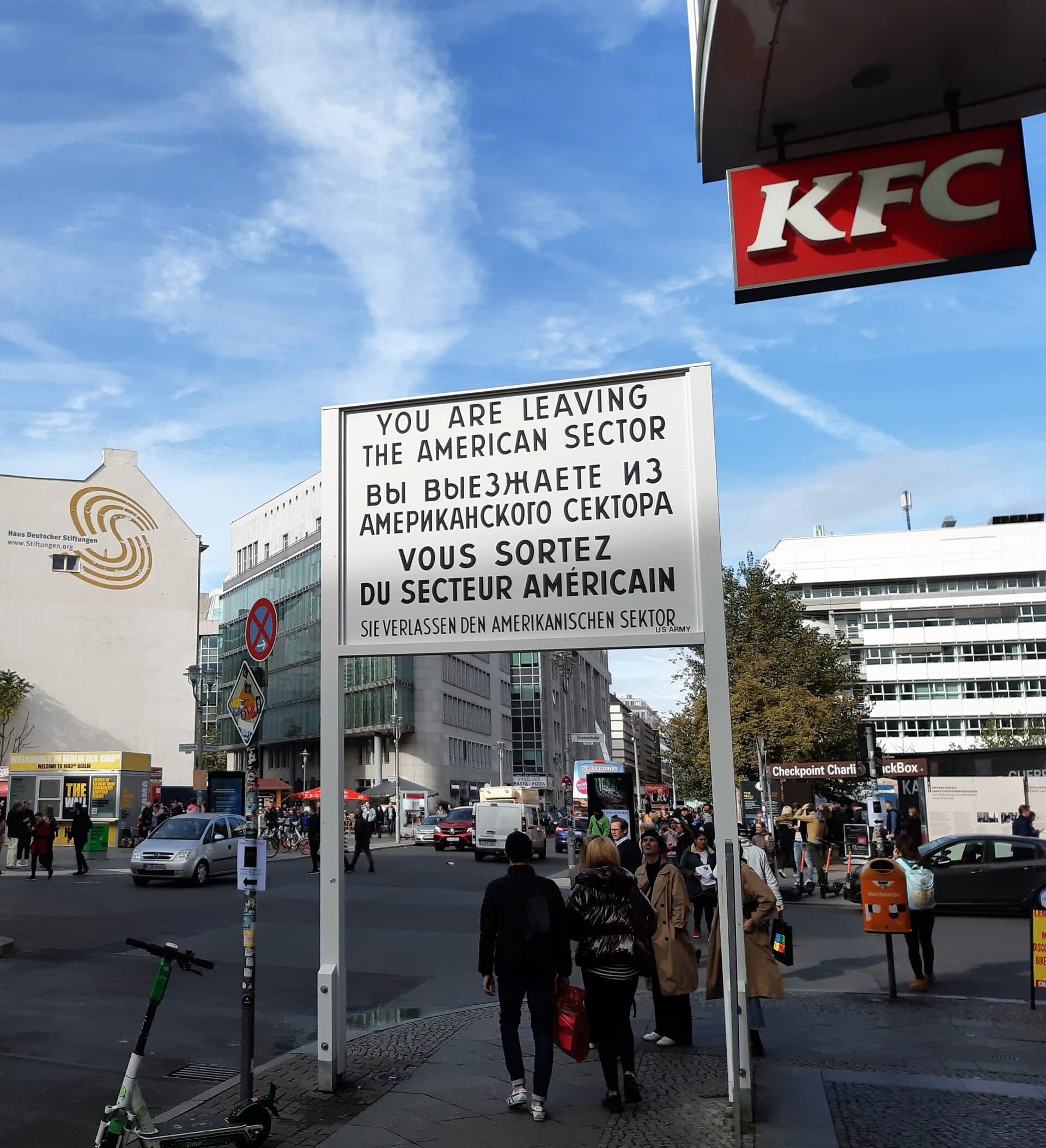 Luogo indimenticato della Berlino della Guerra Fredda rimane ancora oggi il checkpoint Charlie, che si trova a 3 fermate di metro dalla Topographie des Terrors. Il checkpoint è stato per quasi trent’anni il leggendario punto di passaggio internazionale tra ovest ed est. Oggi, qui, a parte un paio di blocchi simbolici, il Muro non è presente. A pochi metri dall’incrocio tra Friedrichstraße e Zimmerstraße, si può vedere però una replica della famosa guardiola del controllo passaporti (l’originale è in un museo), intorno alla quale i turisti si concentrano alla ricerca di una fotografia d’effetto. Le foto vengono ancora meglio quando, talvolta, ci sono davanti alla guardiola degli attori appositamente vestiti da soldati Usa o Urss. I musei intorno al Checkpoint Charlie offrono tantissime informazioni sulla storia della Berlino divisa. Dai densi e un po’ disordinati pannelli narrativi museali si passa in un attimo ai negozi di gadget, dove il brand e le icone della Berlino più turistica sono impressi su centinaia di magliette, penne, matite, tazze, cappellini, borse, astucci, sciarpe e felpe. Tra l’ingresso del principale negozio di gadget e il Checkpoint Charlie Museum si è posizionata Kelly, che indossa l’impermeabile rosso dell’azienda di visite guidate per cui lavora. Kelly ha 23 anni ed è irlandese, il suo compito è raccogliere i turisti presenti nell’area e invitarli a comprare il biglietto per un bus-tour nel resto della città. “Qui ci sono davvero visitatori da tutto il mondo: Europa, Russia, India, Asia. Il mio inglese non basta per comunicare con tutti” – racconta la giovane – “Alcune persone sanno davvero ogni dettaglio sulla città e sono già informate su tutto, altre scoprono solo a metà del viaggio sul bus che Berlino fosse divisa in due da un muro.”