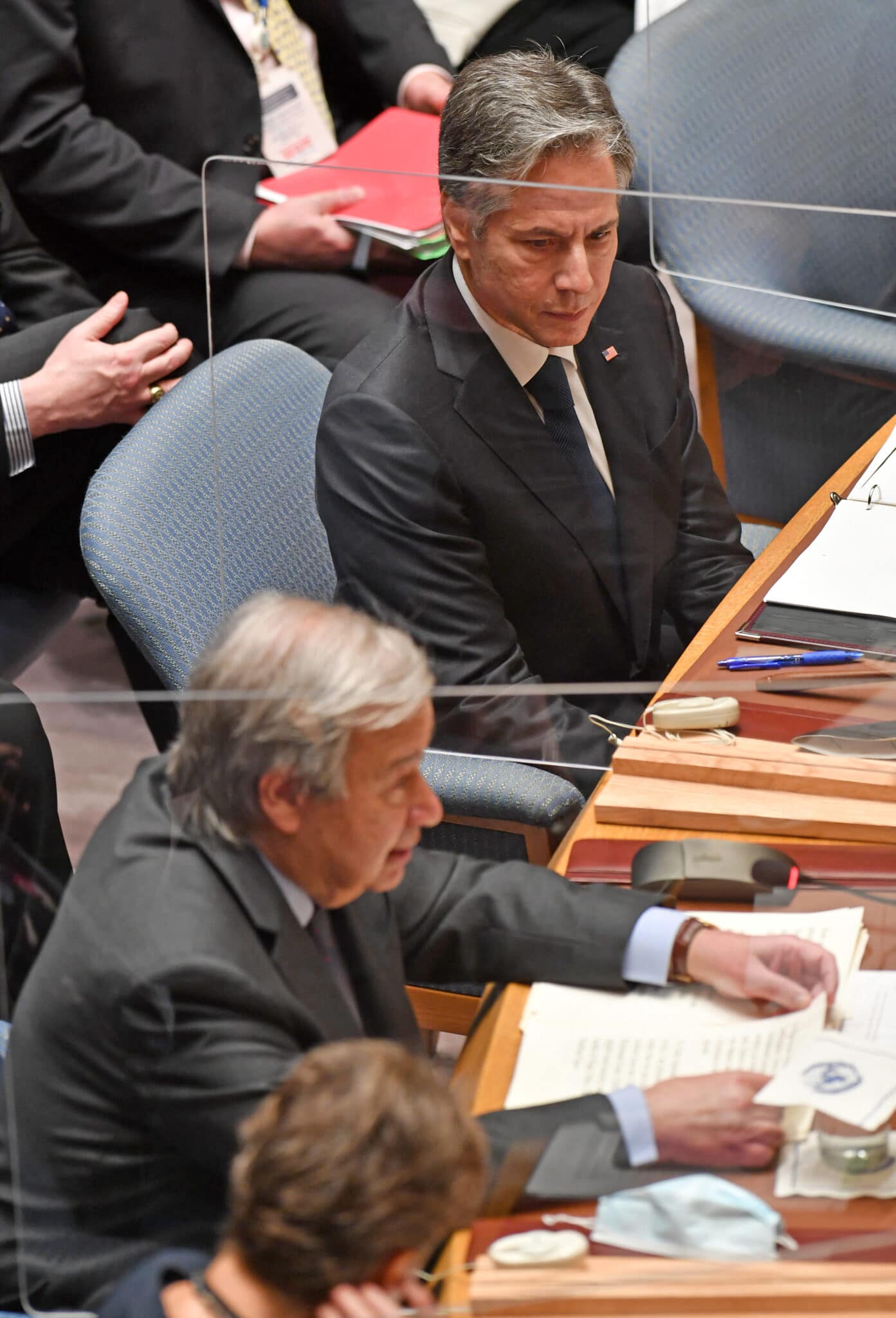 Foto: Il Segretario di Stato Usa Antony Blinken ascolta l’intervento del Segretario generale dell’Onu Antonio Guterres – New York, 19 maggio 2022 (A. Renault / AFP).