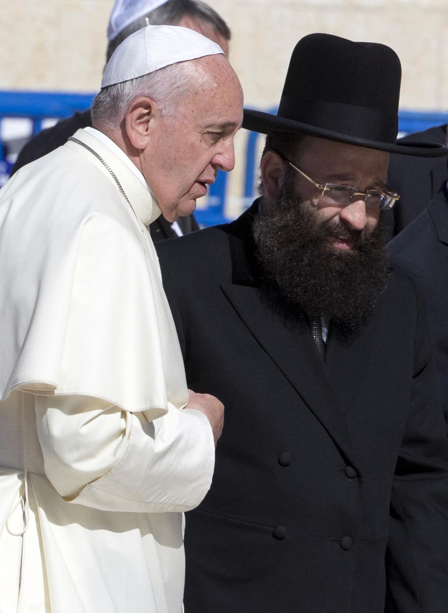Foto: Papa Francesco insieme al Rabbino del Muro del Pianto di Gerusalemme Shmuel Rabinovitch – 26 maggio 2014 (Andrew Medichini / Pool / AFP).