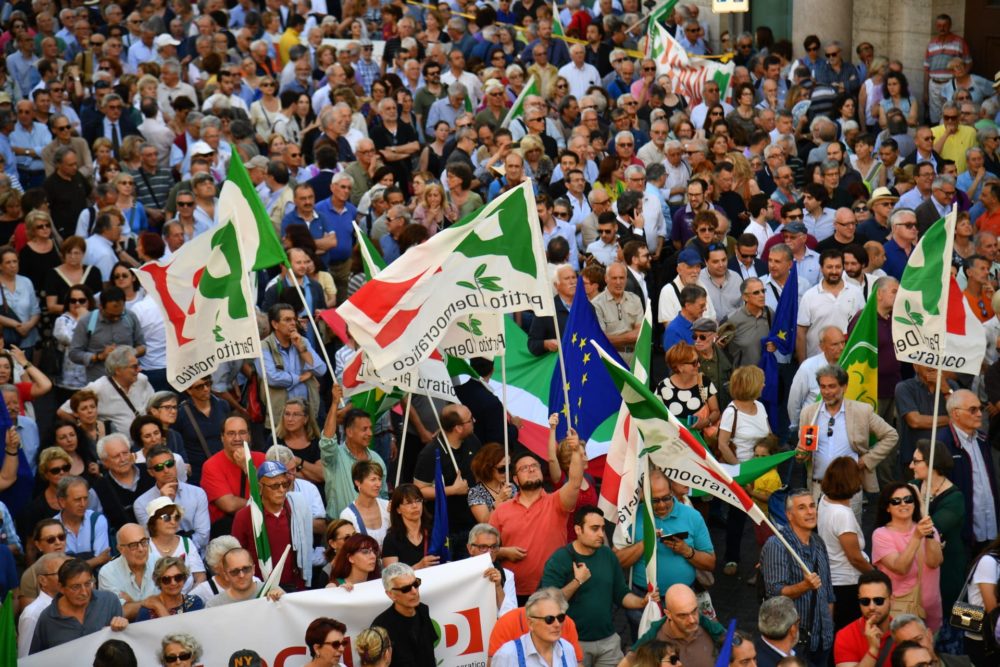 Foto di copertina: Una manifestazione di piazza dopo il giuramento del governo Conte I, il 1 giugno 2018 (foto di Alberto Pizzoli/Afp).