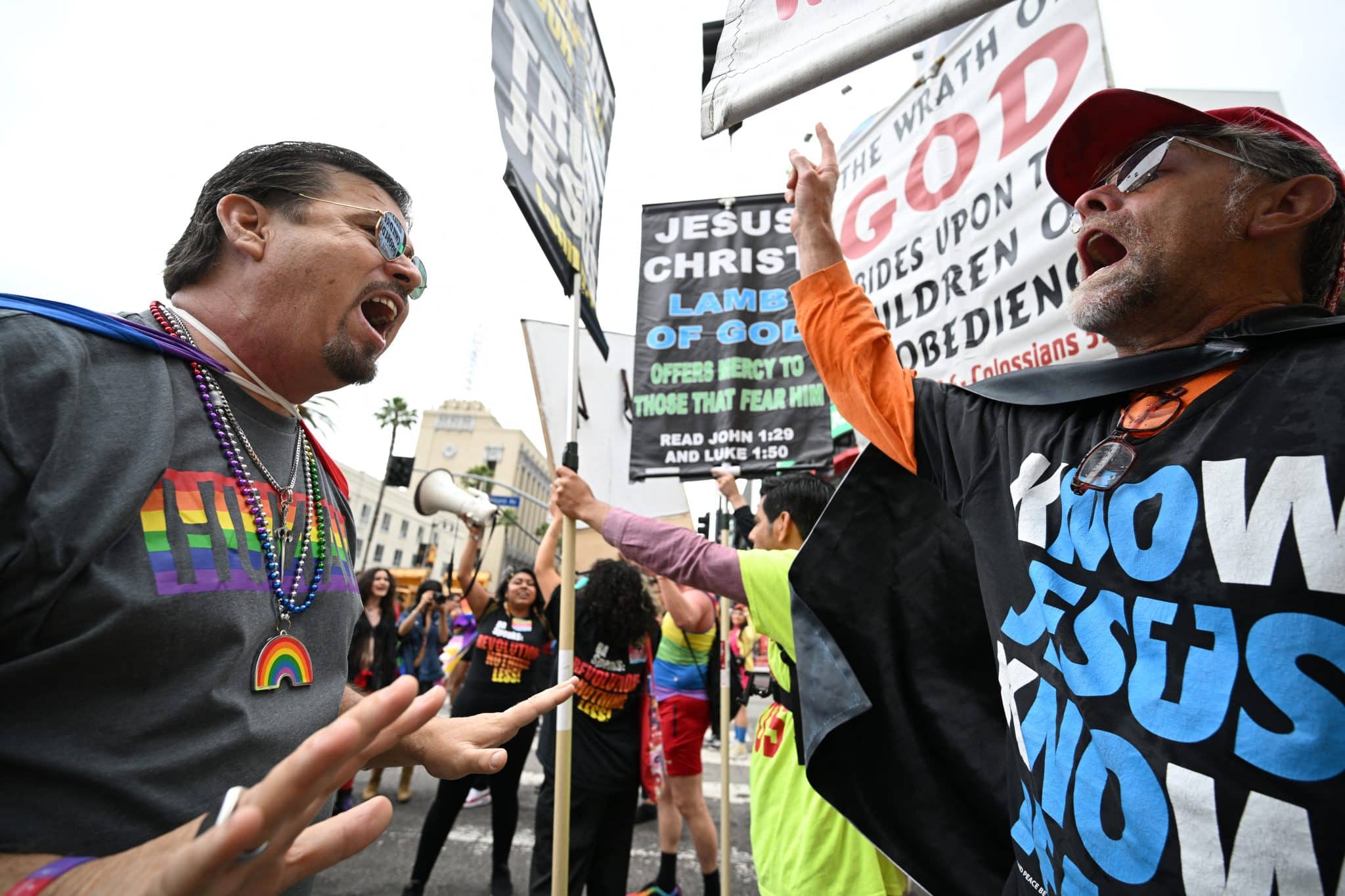Foto di copertina: due manifestanti discutono alla parata del Los Angeles Pride, 11 giugno 2023 a Hollywood, California. (Foto di Robyn Beck / AFP)