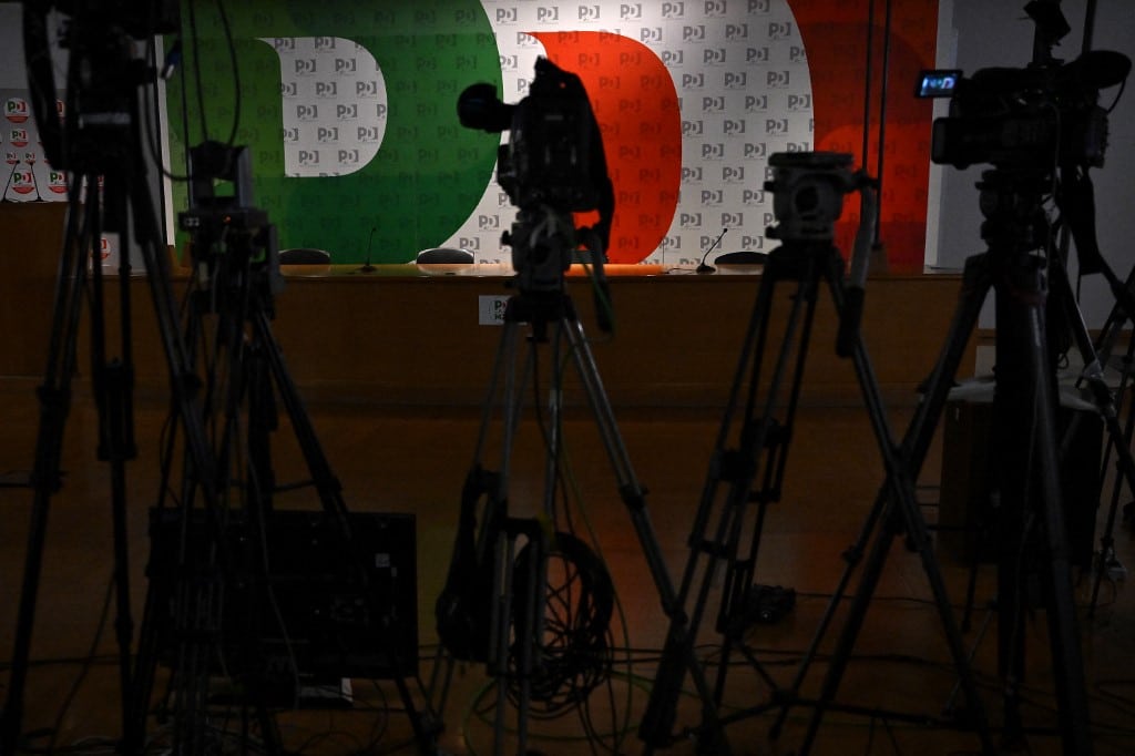 Foto: Le telecamere dei giornalisti nella sala stampa vuota della sede del Partito Democratico il 25 settembre 2022 (T. Fabi/ AFP).