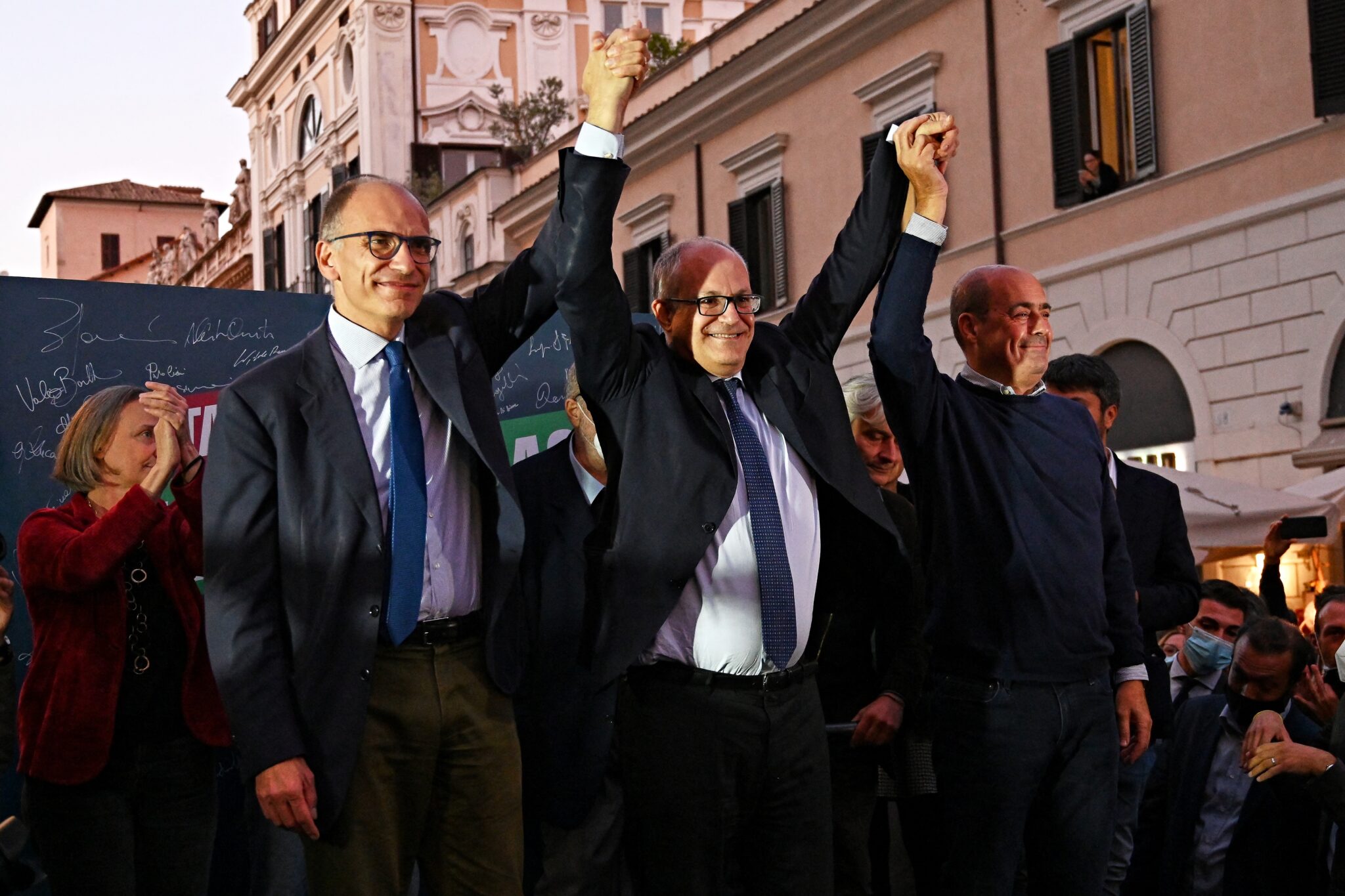 Foto: Il neo-sindaco di Roma Roberto Gualtieri festeggia con Enrico Letta e Nicola Zingaretti – Roma, 18 ottobre 2021 (Andreas Solaro / AFP).