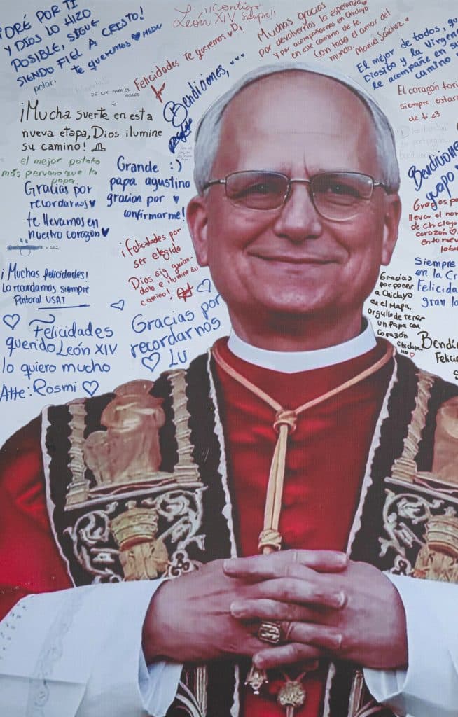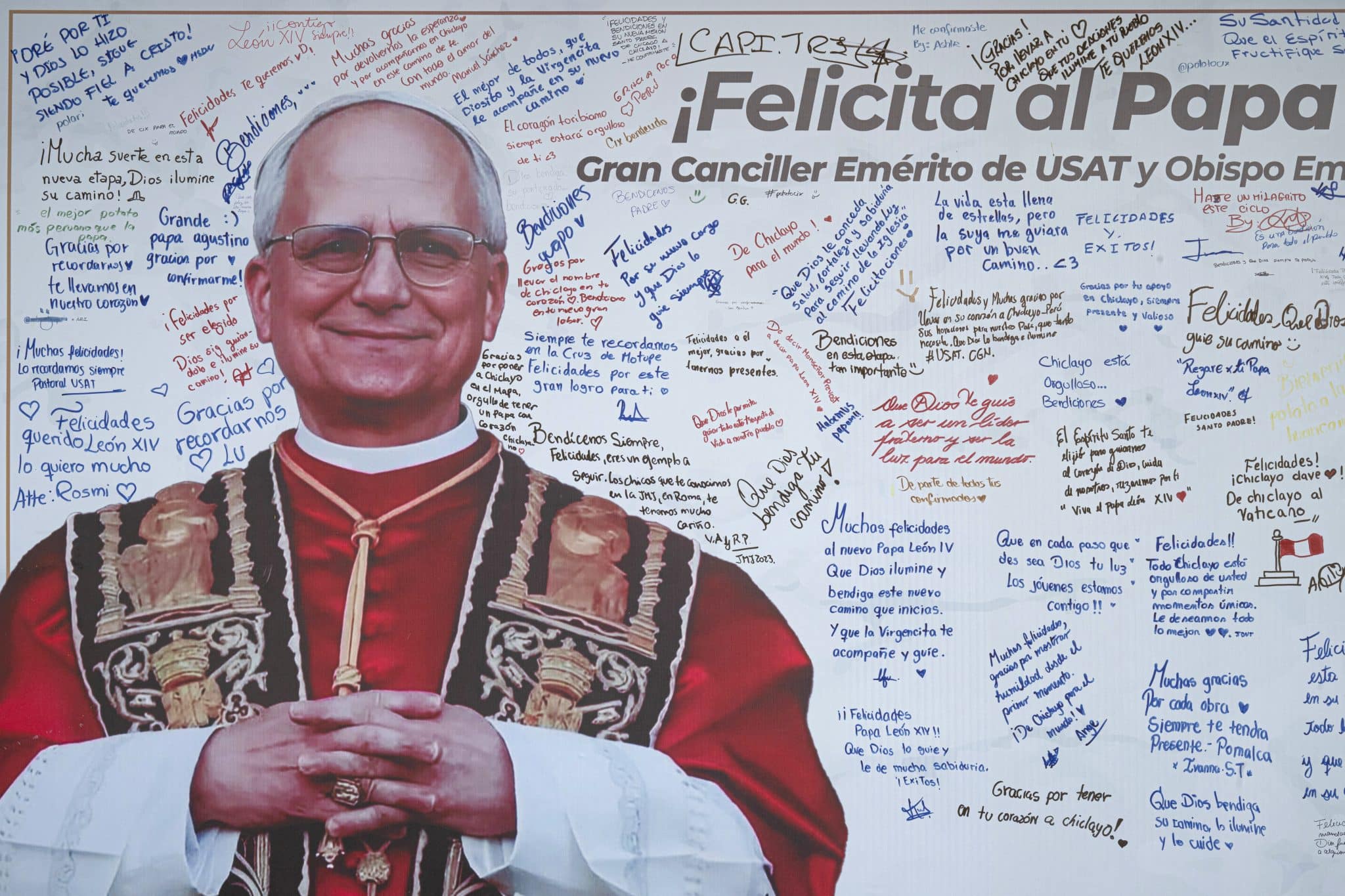 Immagine di copertina: alcuni messaggi scritti su uno striscione esposto all’Università cattolica Santo Toribio de Mogrovejo, in Perù, dopo l’elezione di papa Leone XIV. (Foto di Ernesto Benavides / AFP)