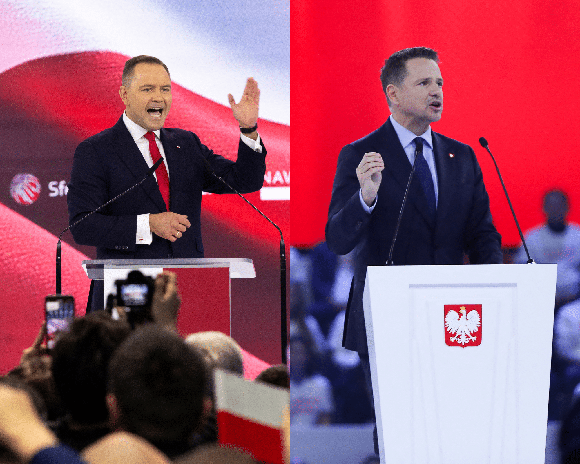 Immagine di copertina: i due candidati al momento favoriti alle presidenziali polacche. A sinistra il candidato di PiS, Karol Nawrocki, in una foto scattata da Andrzej Iwanczuk (NurPhoto via AFP). A destra, Rafal Trzaskowski, di Coalizione Civica (foto di Klaudia Radecka / NurPhoto via AFP).