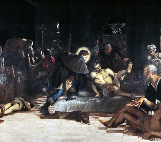 Contento del semplice rimborso delle spese vive, il Tintoretto realizzò il telero del santo che cura gli appestati per la piccola chiesa della Scuola grande di San Rocco. In numero di sei, fra cui quella di San Marco, le scuole grandi erano potenti e ricche congregazioni popolari: contraltari al potere oligarchico di Venezia. Non a caso conservavano nel nome corrente di scuole dei “battuti” il ricordo dei flagellanti che secoli prima avevano trovato a Mestre tregua al loro girovagare.