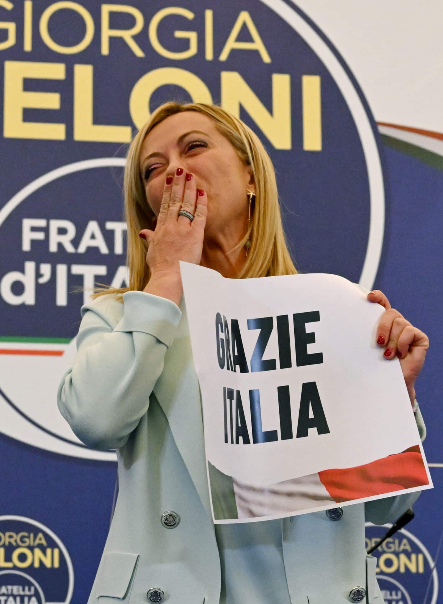 Foto: Giorgia Meloni regge un cartello con la scritta “Grazie Italia” dopo aver pronunciato un discorso nella sede della campagna elettorale del suo partito nella notte del 26 settembre 2022 (Andreas Solaro / AFP)