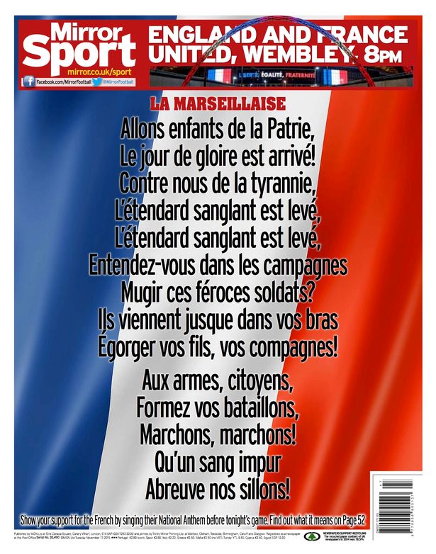 Il Corriere della sera: “Gli stadi svuotati dalla paura. ‘Una bomba pronta ad esplodere’, annullata Germania-Olanda. E salta pure Belgio-Spagna. Ma a Wembley Inghilterra-Francia non si ferma. Ottantamila tifosi cantano la Marsigliese”.