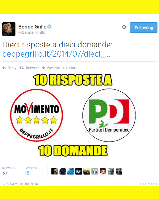 In alto, sulla stessa pagina de Il Fatto: “Senato, immunità & C. Le risposte di Beppe per stanare Matteo”, “Qualche no, ma anche aperture. I 5 Stelle replicano al Pd su legge elettorale e riforme. E ora il premier non può più dire che con i grillini non si può trattare”. Alle 20.05 di ieri i Cinque stelle cedono alla richiesta del Pd e sul blog di Grillo “mettono nero su bianco le risposte sulla legge e elettorale e le riforme”. E il quotidiano sciorina tutte le risposte offerte dal M5S, a partire da sì al ballottaggio, ma con un rilancio: al doppio turno di coalizione dell’Italicum preferiscono il doppio turno di lista. Significa che al ballottaggio vanno i primi due partiti e non le prime due coalizioni.