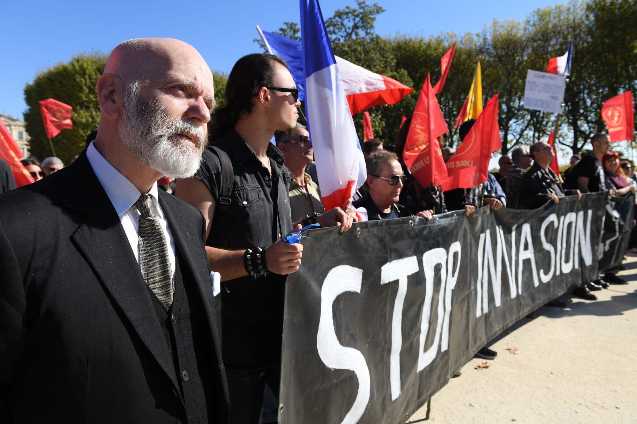 Foto: Lo scrittore Renaud Camus guida una manifestazione del movimento di estrema destra “La ligue du Midi” – Montpellier, 8 ottobre 2016 (P. Guyot / AFP).