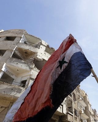 Una bandiera siriana sventola in una strada distrutta nell’ex città ribelle di Jobar, nel Ghouta orientale, 2 aprile 2018.