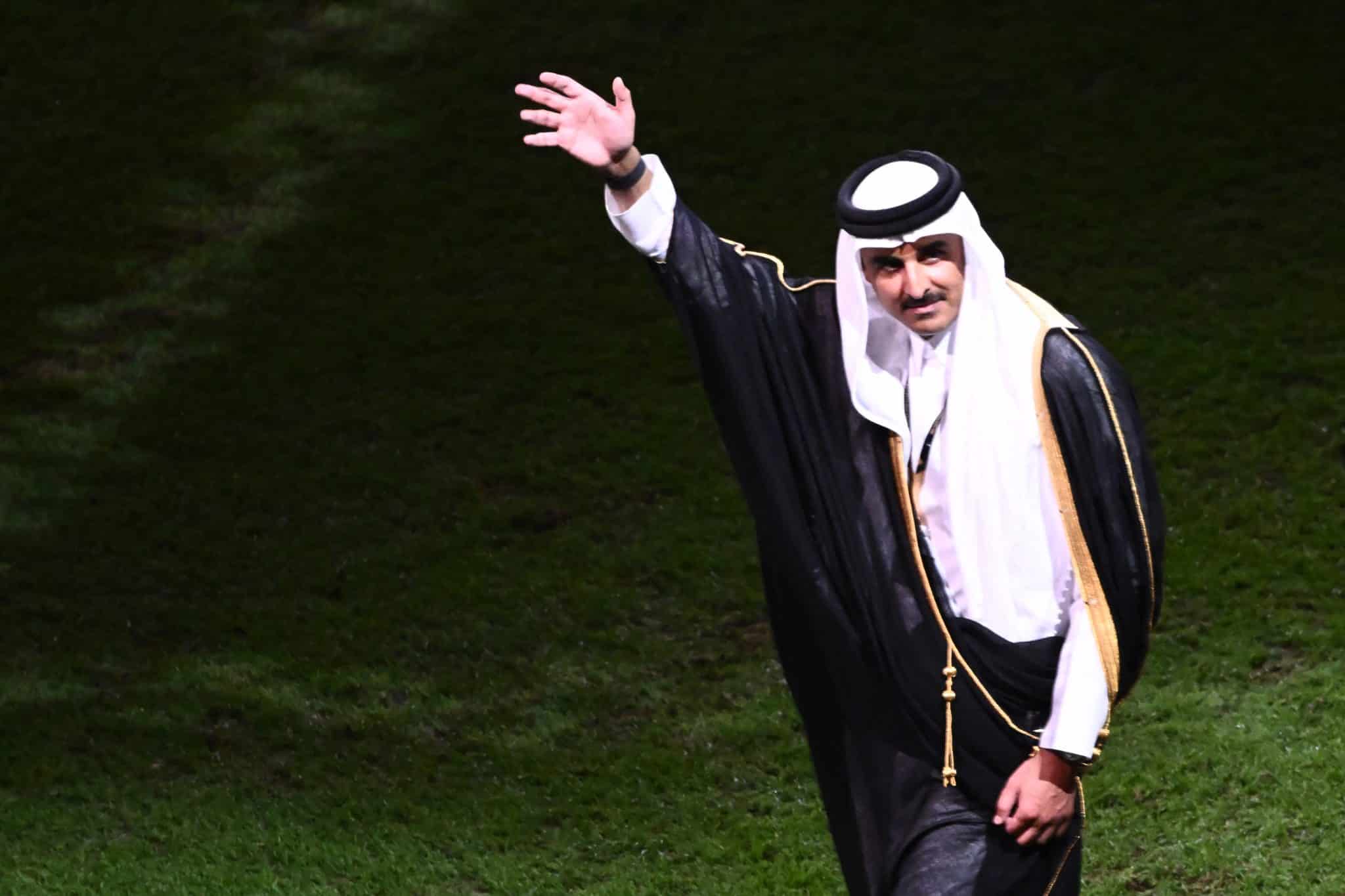 Immagine di copertina: l’emiro del Qatar Sheikh Tamim bin Hamad al-Thani saluta il pubblico al termine della finale dei Mondiali del 2022. Foto di Jewel Samad / AFP.