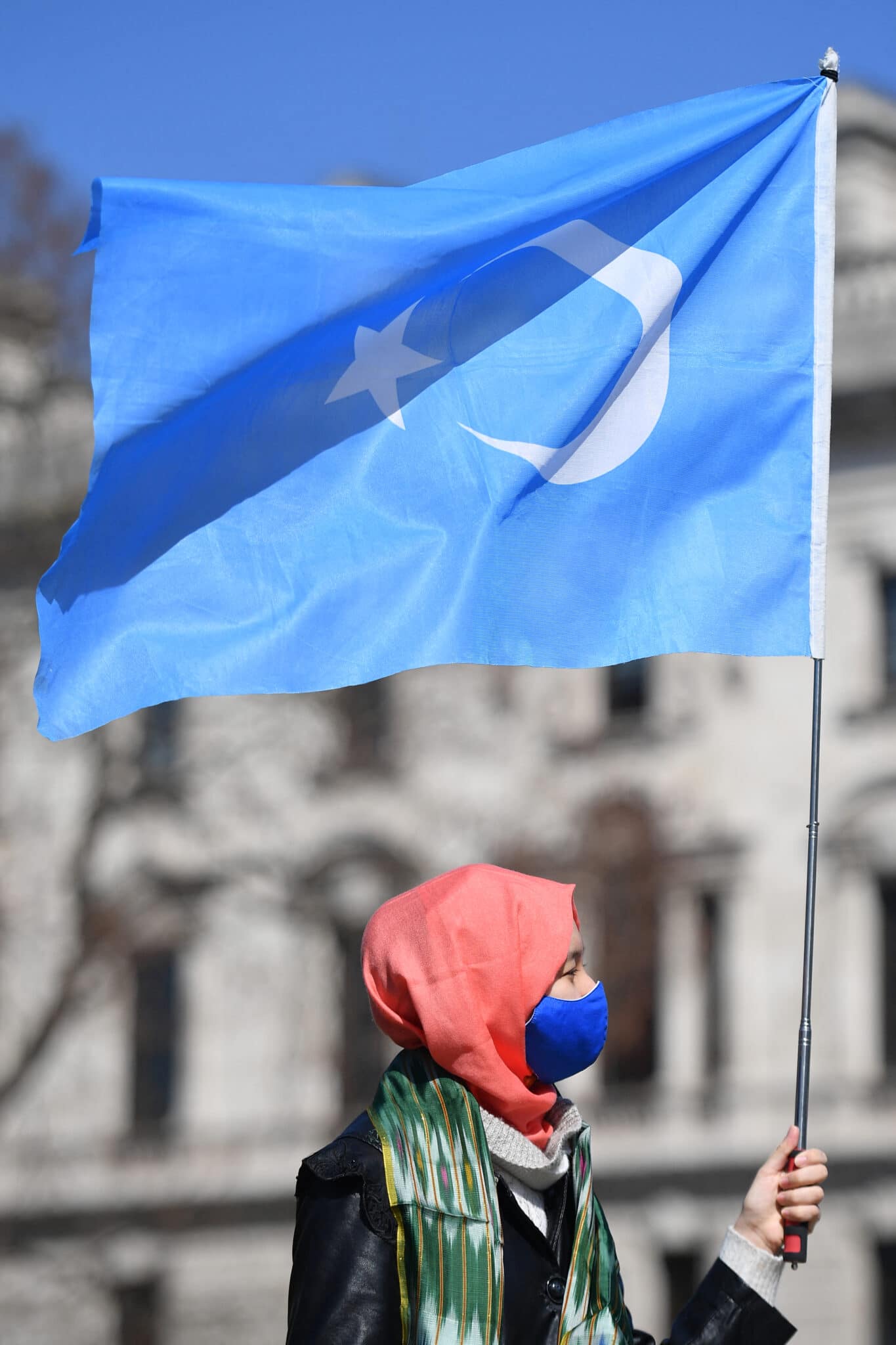 Foto: Una donna sventola la bandiera adottata dal movimento per l’indipendenza del Turkestan orientale ad una manifestazione contro la repressione degli Uiguri – Londra, 22 aprile 2021 (Justin TALLIS / AFP).