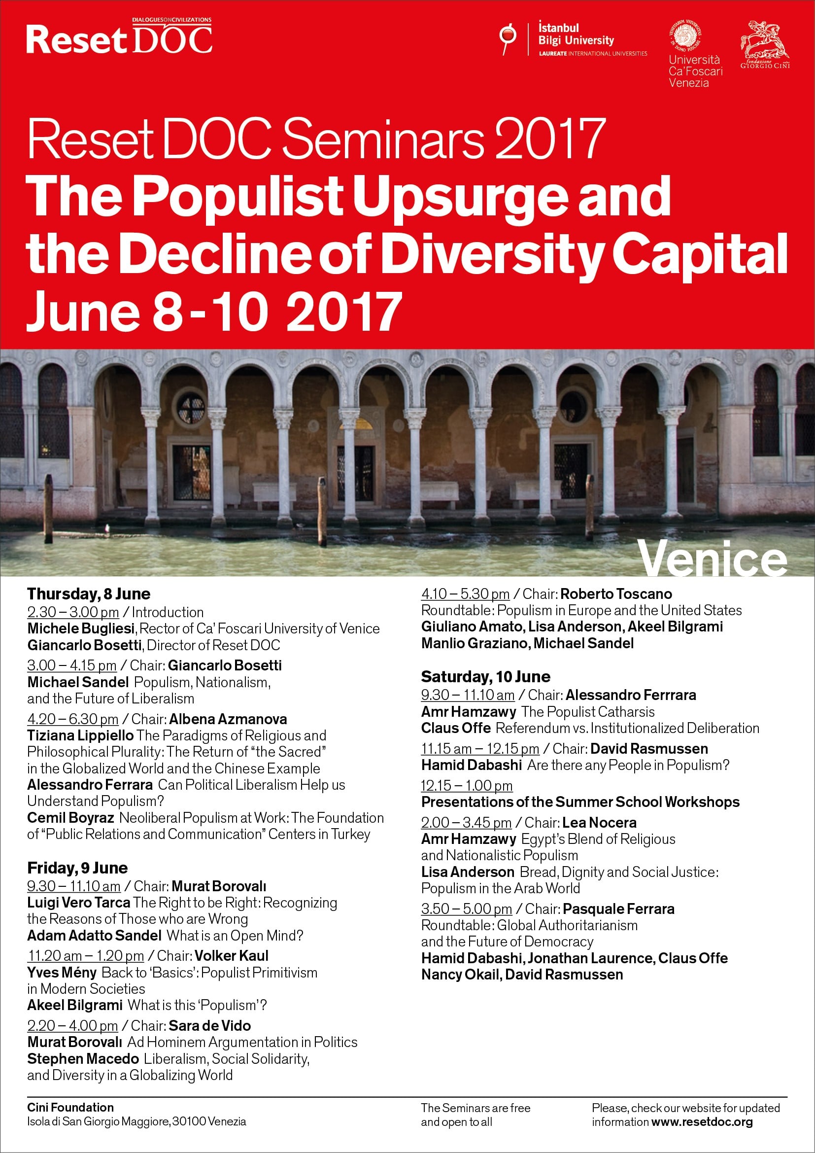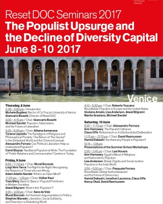 Dall’8 al 10 giugno 2017, presso la Fondazione Cini (Isola di San Giorgio, Venezia), l’Associazione Internazionale Reset-Dialogues on Civilisations inaugura a Venezia l’edizione 2017 di Reset-DoC Seminars, i dialoghi filosofici Est-Ovest svoltisi per un decennio a Istanbul.