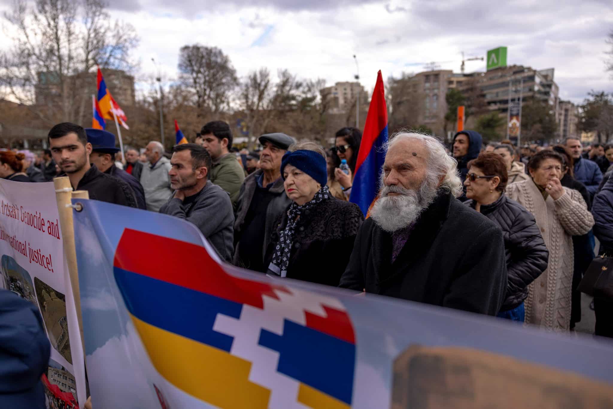 Immagine di copertina: una folla di residenti armeni e rifugiati del Nagorno Karabakh sfila a Freedom Square, nella capitale armena Yerevan il 20 marzo 2024, per chiedere migliori condizioni abitative per coloro che sono fuggiti dall’enclave, conquistata dall’Azerbaijian. Foto di Anthony Pizzoferrato/Middle East Images via AFP.