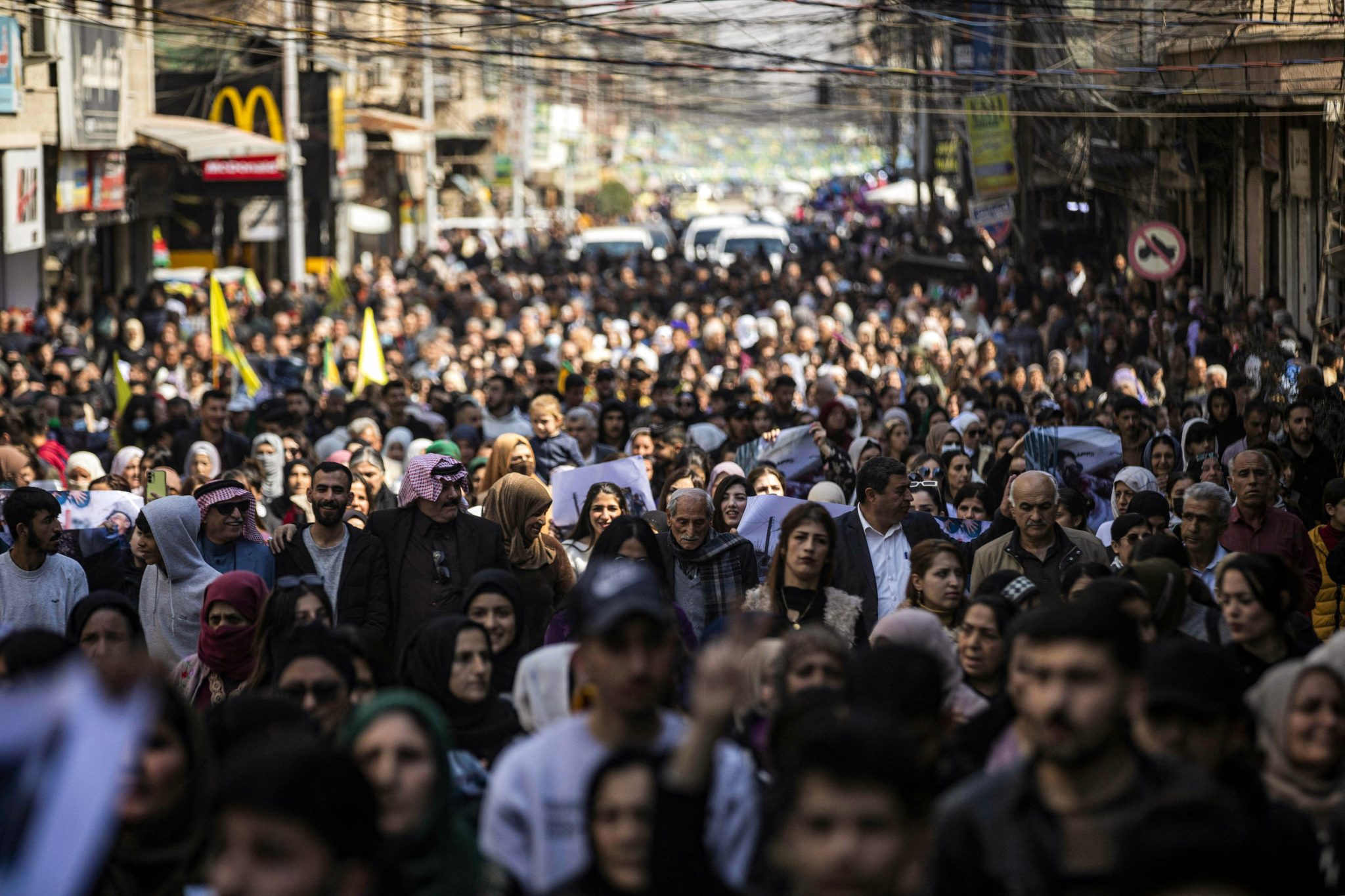 Immagine di copertina: una manifestazione nella città di Qamishli l’11 marzo 2025 contro le violenze che hanno colpito gli alawiti (foto di Delil Souleiman / AFP).